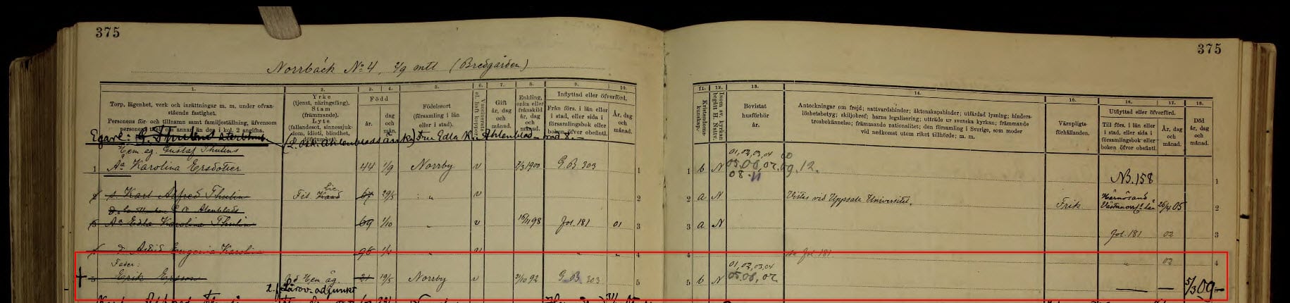Because these Swedish household records listed the exact date and place of each person's birth, it was clear that we had the right Eric Ersson. This Eric's birth was consistently listed as 19 May 1821 in Norrby parish.