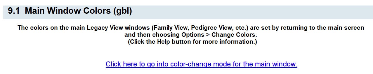 The first option in this box will bring you to the same dialog box as in Option 9.2 (next one down) so we will save that for now. The second option allows you to choose one of Legacy's default color schemes which you can use as is or you can customize it. The main thing that you need to know when you see this dialog box on your screen is that you need to click on the Legacy screen itself to change any colors. For example, if you are on the Family View and you click the background you will then be able to change that. If you click on one of the labels you will be able to change that. Just click around the screen and you will get all kinds of popup boxes to change the colors. Also, You need to make sure that you switch between the different views (Family, Pedigree, etc.) because these have their own colors.