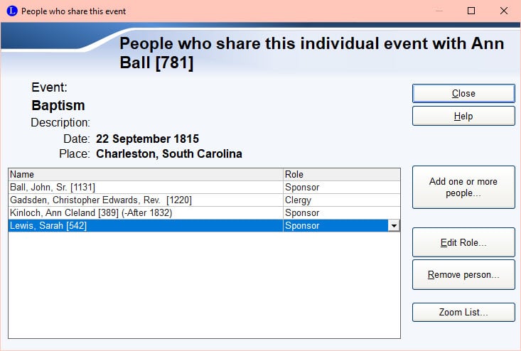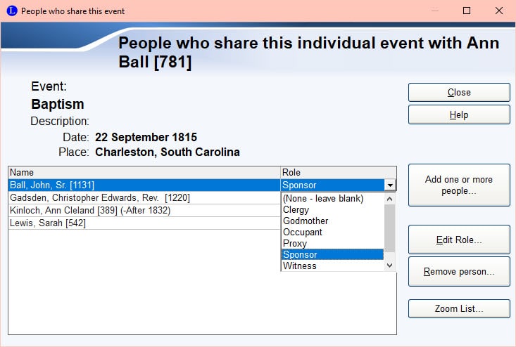 Here are my four people. They are not witnesses though. I am going to have to change their roll by clicking the down arrow next to the roll. John Ball, Sr. was one of the Sponsors so I have change his role to that. I already had Sponsor in the list because I work with baptisms a lot. You can see other roles as well. I can't do the screenshots at full screen so what you don't see is that you can scroll down the list and then you will find the option to Add/Edit Roles. You can add new roles and edit existing roles.