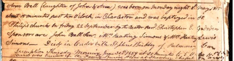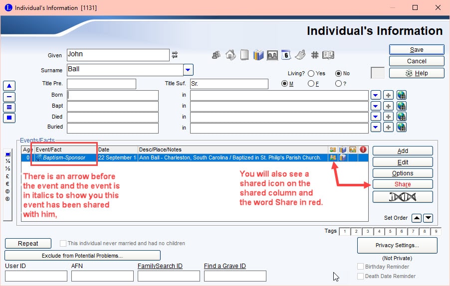 Here is Ann Ball. If you click the plus (+) next to her baptism you will see the option to share the event. The plus sign is already colored in because I have entered some baptism notes. You can see that the Baptism Notes is check marked. Click the Baptism Event Shared option.
