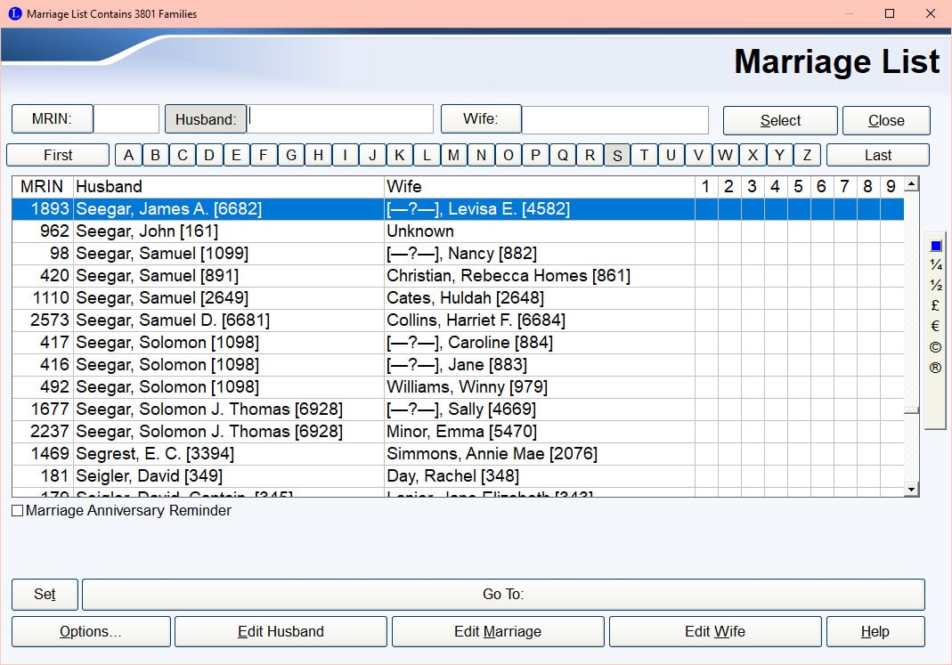 The Set and Go To: buttons at the bottom allow you to set one Marriage Bookmark. Once you set it, the couple's name will be on the Go To: button