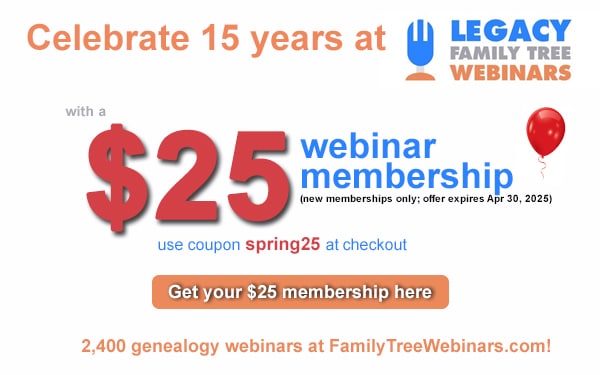 To celebrate the 15th anniversary of Legacy Family Tree Webinars, we’re giving you 50% off a full year of genealogy education. For a limited time, you can become a member for just $25!
